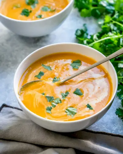 - מעבירים בזהירות את המרק החם לבלנדר בעזרת מצקת (או משתמשים בבלנדר טבילה). מוסיפים את חלב הקוקוס ומערבבים עד לקבלת מרקם חלק וקרמי. טועמים ומתקנים תיבול לפי הרצון. מגישים מסובבים עם טפטוף חלב קוקוס ומעליו כוסברה טרייה.