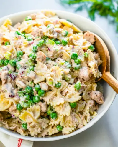 פחית טונה הופכת לסלטי פסטה טעימים ברצינות: כמו סלט פסטה טונה נוסטלגי זה! זה קרמי אבל לא עשיר מדי, עם שפריץ של חומץ יין לבן ומפזר שמיר מיובש. זוהי ארוחת מזווה פשוטה ברצינות שנותנת לנו אווירה נוסטלגית נעימה... והיא עובדת גם כארוחת צהריים מוכנה מראש.