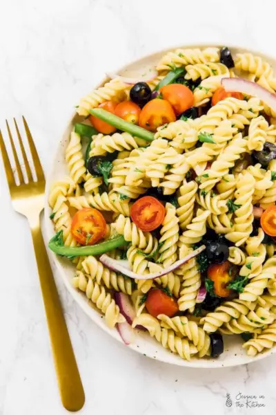 אין צורך בבשר או גבינה בסלט פסטה...באמת! נסה את המתכון הקל והקל הזה לסלט פסטה טבעוני קר: מושלם לארוחת צהריים, ארוחת ערב מהירה בלילה, ועוד הרבה יותר! הוא עמוס בטעם ומעל ויניגרט איטלקי תוצרת בית. בְּאֶמצָעוּת ג'סיקה במטבח