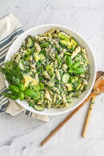 המתכון הזה לסלט פסטה קר הוא כולו ירוק! הוא עמוס בירקות קיץ בהירים ופריכים כמו סלרי, אספרגוס, מלפפונים, ירוקי קולארד ואפונה. לאחר מכן הוסף רוטב בטעם מלא, קרמי וירוק עשב כדי לכסות הכל. בְּאֶמצָעוּת מייקו והמנה
