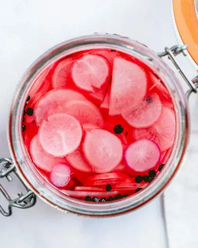 רוצים תבלין שמכניס תחושה לכל מתכון? היכנסו: צנוניות כבושים מהירים! זה מה לעשות עם חבורה של צנוניות במקרר שלך. פורסים אותם דק וזורקים אותם לצנצנת עם חומץ, מלח וסוכר, ואז תנו למרכיבים לעשות את החלק הקשה! כל מה שאתה צריך לעשות הוא לחכות שעה אחת; אין צורך בציוד שימורים. הם מחייה כל ארוחה, מ כריכים אֶל טאקו !