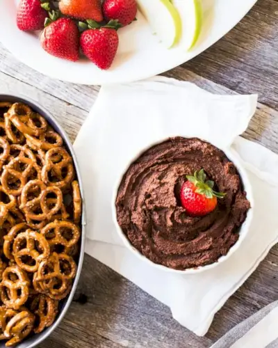 שׁוֹקוֹלַד חומוס? הסיבוב הייחודי הזה על המטבל המלוח הוא כמובן לא מתכון קלאסי לסילבסטר, אבל שמע אותנו! הגרסה המתוקה הזו של חומוס עשויה עם אבקת קקאו וסירופ מייפל. זה הופך למטבל השוקולד המריר הטוב ביותר עבור תותים, פרוסות תפוח ירוק ובייגלה. (הו, השילוב של מתוק ומלוח!).