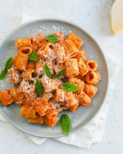 הרעיון הזה למסיבת ארוחת ערב איטלקית עוסק בפשטות! לפסטה ברוטב וודקה לוקח בערך שעה להתבשל, אבל זה בעיקר מנותק. אתה יכול לשים אותו על הכיריים ולתת לו להתבשל בזמן שאתה מכין את שאר המתכונים וההכנות. זה באמת הכל על הטוב שבמרכיבים פשוטים ואיכותיים.
