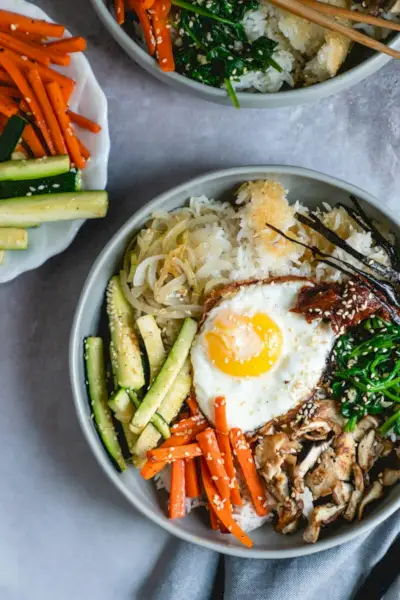 ביבימבאפ הוא א מנת אורז קוריאני : זו קערה של אורז לבן חם עם ירקות מתובלים, גוצ'וג'אנג חריף וביצה מטוגנת. החלק הכי טוב: מערבבים את המנה יחד רגע לפני שאוכלים אותה! זה ממזג יחד את כל הטעמים הכבושים והמותססים מהירקות עם חלמון הביצה הקרמי. זה אידיאלי להגשה למסיבות ארוחת ערב!