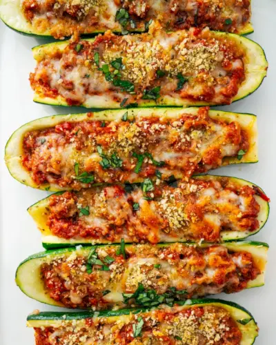 חללו את הקישואים לקליפות, ואז ממלאים אותו בנקניק, עגבניות, שום, מוצרלה וגבינת פרמזן. מעל עם כמה פירורי לחם פריכים, אופים עד להזהבה, ואוו! אלה עמוסים בטעם מלוח עז. המתכון הזה עושה א חובב קישואים מתוך אף אחד!