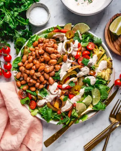 המתכון הזה לסלט פאג'יטה הוא אחד הרעיונות המומלצים שלנו לארוחת ערב, מפוצץ בירקות חרוכים ומכוסה ברוטב רנץ' סלסה שמנת! אנחנו אוכלים את זה לעתים קרובות וזה עובד כמעט לכל דיאטה: זה נטול גלוטן, צמחוני או טבעוני בקלות - בנוסף זה אידיאלי לשרת קהל!