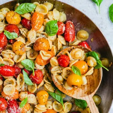 פסטה עגבניות שרי זו משלבת עגבניות מתוקות עם שלפוחיות במחבת חמה עם בזיליקום טרי ופרמזן. רעיון לארוחת ערב קלה שפשוט מהממת!