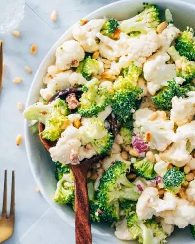 הנה מתכון לסלט קיץ מהנה שאכלנו ב-Repeat: סלט כרובית ברוקולי! ברוקולי וכרובית פריכים מכוסים ברוטב זינגי קרמי, ואז משודכים עם עגבניות מיובשות, צנוברים קלויים וגבינת פטה. לאחרונה הבאנו את זה לבישול וכשמישהו אמר וואו! אחרי הביס הראשון, ידענו שזה מנצח.