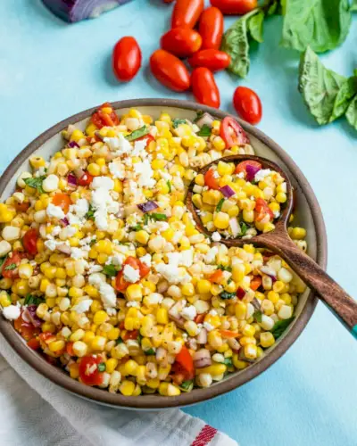 זה לא קיץ עד שתכין סלט תירס! זה הכל על טעם רענן: צרורות מתוקות של תירס, עגבניות עסיסיות ובזיליקום עשבוני עם ויניגרט חריף וקליל. אם אתה כמונו...לא תוכל להפסיק לאכול את זה! למעלה עם פירורי גבינת פטה אם תרצו, או לשמור אותה כסלט צמחי: זה טוב באותה מידה.
