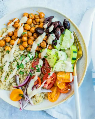 מתכון לקערות קוסקוס דיאטה ים תיכונית אלה הוא חזרה נפוצה ברפרטואר מתכוני ארוחת הערב שלנו. מַדוּעַ? תוך 25 דקות בלבד, יש לך קערה טריה של ירקות טעימים שנחנקה ב רוטב טחינה לימון חריף . זו דרך טעימה באמת לאכול את הירקות שלך. אם תרצו, החליפו את הקוסקוס בא דגנים מלאים כְּמוֹ קינואה אוֹ אורז חום . זה יהיה גם טעים עם רוטב לסלט יווני .