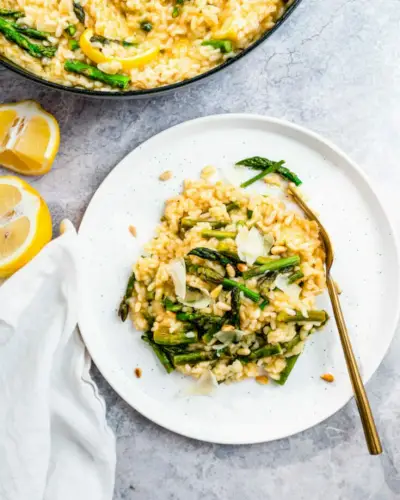 שמנת, מלוחה, פריכה וחריפה: ריזוטו האספרגוס הזה הוא באמת נִשׂגָב . צולים קצת אספרגוס עם לימון באותו זמן שאתה מערבב ריזוטו שמנת על הכיריים. לאחר מכן זרקו את האספרגוס הירוק הרך והרך לתוך הריזוטו, ממש יחד עם הלימון.
