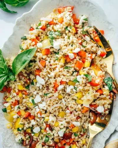 הנה ייחודי סלט דגנים שלא תוכל לעמוד בפניו: נסה סלט שעורה! שעורה דגנים מלאים אינה מככבת לעתים קרובות בסלט; בדרך כלל דגנים טרנדיים יותר כמו קינואה ו פארו לרסן עליון. אבל המרקם הלעיס והטעם האגוזי שלו הם הניגוד המושלם לירקות פריכים, שום, עשבי תיבול ורוטב שמן זית לימון.