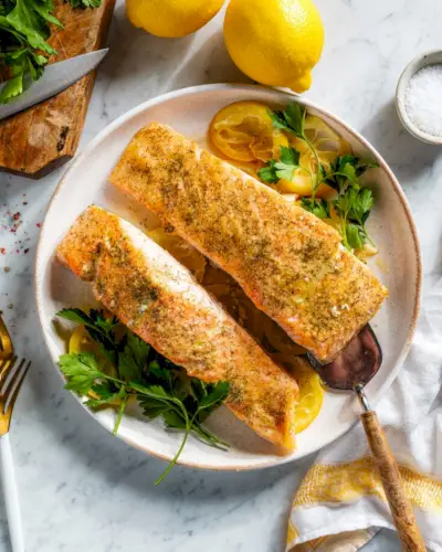 הסלמון נצלה ממש על גבי פרוסות לימון אמיתיות וחמאה, אשר נאפה לרוטב שניתן לשפוך על הדג הרך. מתובל במעט שמיר ואבקת שום, אפשר לצלות את החלק העליון כדי שיהיה פריך קל לאחר האפייה. זה כל כך פשוט ואחת הדרכים החדשות האהובות עלינו לבשל את הדג הטעים הזה!