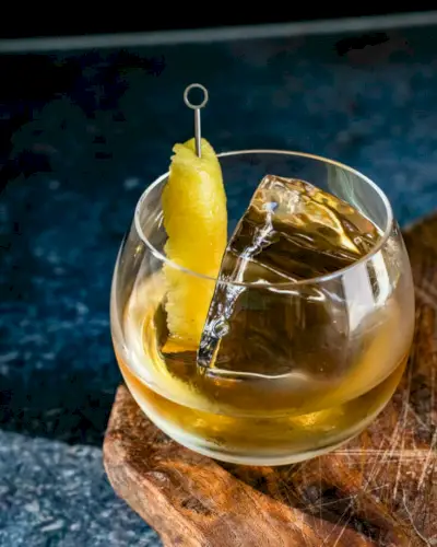 - מסננים את המשקה לכוס Lowball עם קוביית קרח אחת גדולה.