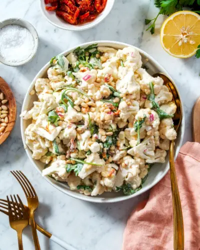 סלט הכרובית הזה מפוצץ בטעם קיצי! רוטב קרמי משלים את הכרובית הפריכה, עגבניות מיובשות מוסיפות טאנג, וצנוברים קלויים מביאים לקראנץ' מענג.