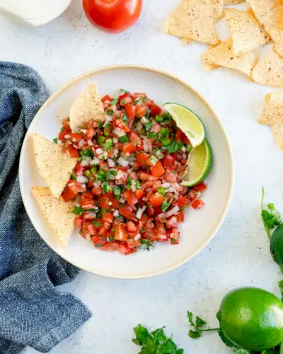 השתמש בעגבניות הקיץ האלה לפיקו דה גאלו תוצרת בית! רק 6 מרכיבים, זה המטבל האידיאלי עבור צ'יפס טורטייה ותוספת לדגים או טאקו.