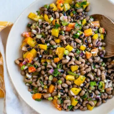 הנה סלט טרי להפליא שמתאים לכל עונה: סלט אפונה שחורה ! כי אפונה שחורה היא לא רק בשביל שנה חדשה . אתה יכול להפוך את הקטניה הדשנה הזו לבריאה סלט טבעוני מלא בחלבון מהצומח. הוסף ירקות טריים כמו פלפל חריף ובצל ירוק, ואז סיים עם קוביות מנגו או אפרסק לקצת מתיקות! הוא מכוסה בויניגרט חריף שגורם לכולם לחזור לעוד. אלכס ואני אוהבים את זה בתור תוספת בריאה לדגים, או עם שלישיית סלטים כרעיון בריא לארוחת צהריים.