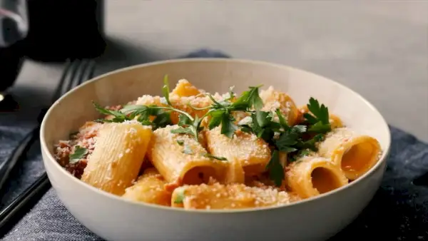 מתכון ריגטוני קרמי זה נוצר בהשראת הסומלייה דריק סי ווסטברוק מ-1340 Beer Wine Spirits בשיקגו, אשר כינה אותו המנה האידיאלית שלו לשילוב עם יין. העבודה הראשונה שלי במסעדה הייתה במסעדה איטלקית; הייתי מבקש מבשלן הפסטה לערבב רוטב אדום עם שפריץ של שמנת, ריף על רוטב וודקה,' הוא אומר. ״אני עדיין אוהב רוטב עגבניות שמנת על פסטה קצרה, בשילוב עם יינות אדומים עסיסיים ורעננים כמו צוויגלט או קברנה פרנק ללא אלון שמציעים רק נגיעה של פאנק וחמיצות בינונית.