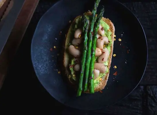 טוסט אבוקדו עם אספרגוס ושעועית לבנה