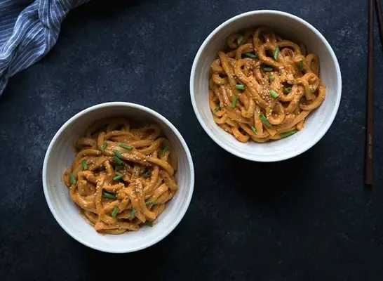 אטריות אודון קפואות הן הסוד למנה המהירה המושלמת הזו. אמבטיה מהירה במים רותחים מפשירה את האטריות שמושלכים אז עם חמאת שקדים שטעם ברוטב סויה, חומץ, סמבל, שמן שומשום, שום ורוטב דגים. אתה יכול אפילו לזרוק שקית של ברוקולי מיקרוגל עבור קצת יותר אגרוף סיבים.