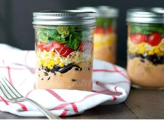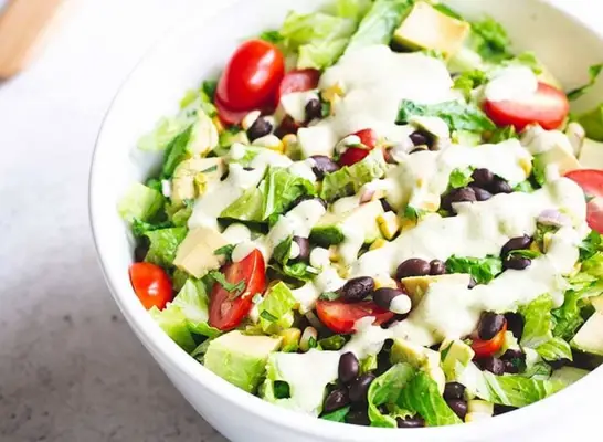 אבוקדו, תירס, שעועית שחורה ובצל אדום מושלכים מעל חסה רומאנה לסלט זה מלא סיבים. רוטב מהיר של שמנת חמוצה, צללונים, מיץ ליים, פלפל אדום, דבש ושמן זית הופכים ארוחת צהריים למסיבה לפה.