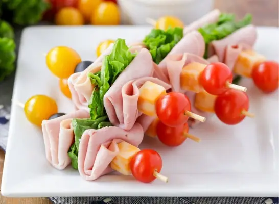 ערימת ירקות טריים, חתכים קרים נמוכים בינונית וקוביות גבינה קטנות על שיפודים פשוט נראים יותר מהנים מסלט או כריך, לא? טבלו את התינוקות האלה בלבוש דל שומן לבחירה ותיהנו!