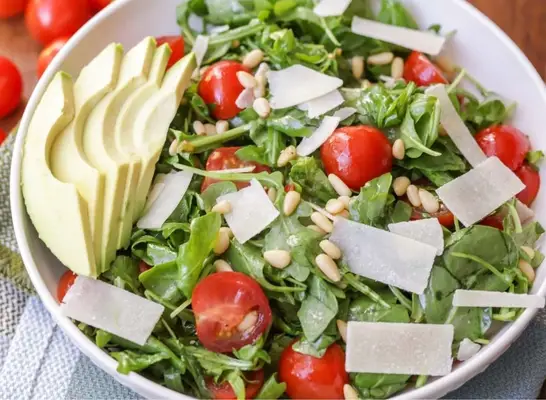 סלטים הם מלך ארוחות הצהריים המהירות ויכולים למלא אם אתה מתכנן אותם נכון. סלט ארוגולה בהיר זה ארוז עגבניות, אבוקדו, אגוזי אורן וגבינת פרמזן להפסקה מספקת ובריאה של אמצע היום.