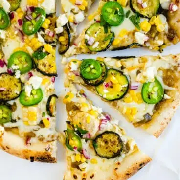 פיצת הג'לפנו החריפה הזו היא הדרך הטובה ביותר ליהנות מהפלפל האדיר הזה על פשטידה גבינתית! הפלפל הטרי מביא טלטלה של חום, יחד עם קישואים, תירס וסלסה ורדה.