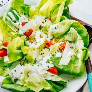 סלט חסה חמאה פריך זה פשוט ורענן! הלבישו את החסה העדינה הזו ברוטב פרמזן, עירית ופירורי לחם.
