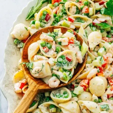 רוצים צד מנחם לקיץ? נסה את זה סלט פסטה שרימפס ! זֶה סלט פסטה קר הוא קרמי ועשבוני, עם אווירת רטרו של פיקניקים שכונתיים וארוחות ערב משפחתיות. מככבים בו קליפות תינוק שרימפס ופסטה רכים, עם רוטב שמנת, שמיר טרי, אפונה וירקות פריכים. משהו בטעם יגרום לך לחזור לעוד! זה דומה לסלט שאמא שלי הכינה כשגדלתי, ואלכס ואני לא יכולנו לקבל מספיק ממנו.