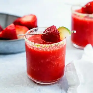 מרגריטה תות זו מגניבה, קפואה, חריפה וכל כך מרעננת! הסיבוב הפירותי הזה על הקוקטייל הקלאסי הוא משקה אלכוהולי קל באמצעות פירות יער קפואים.